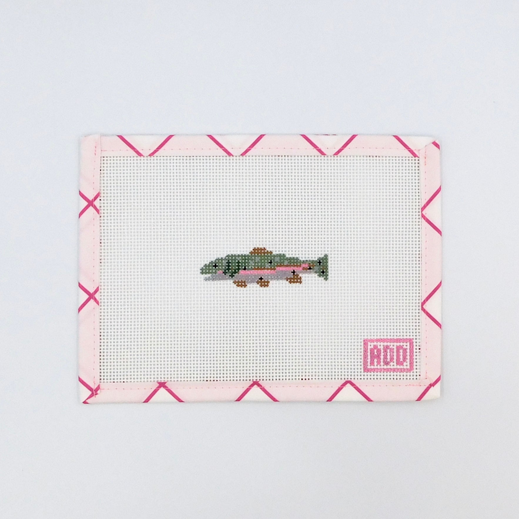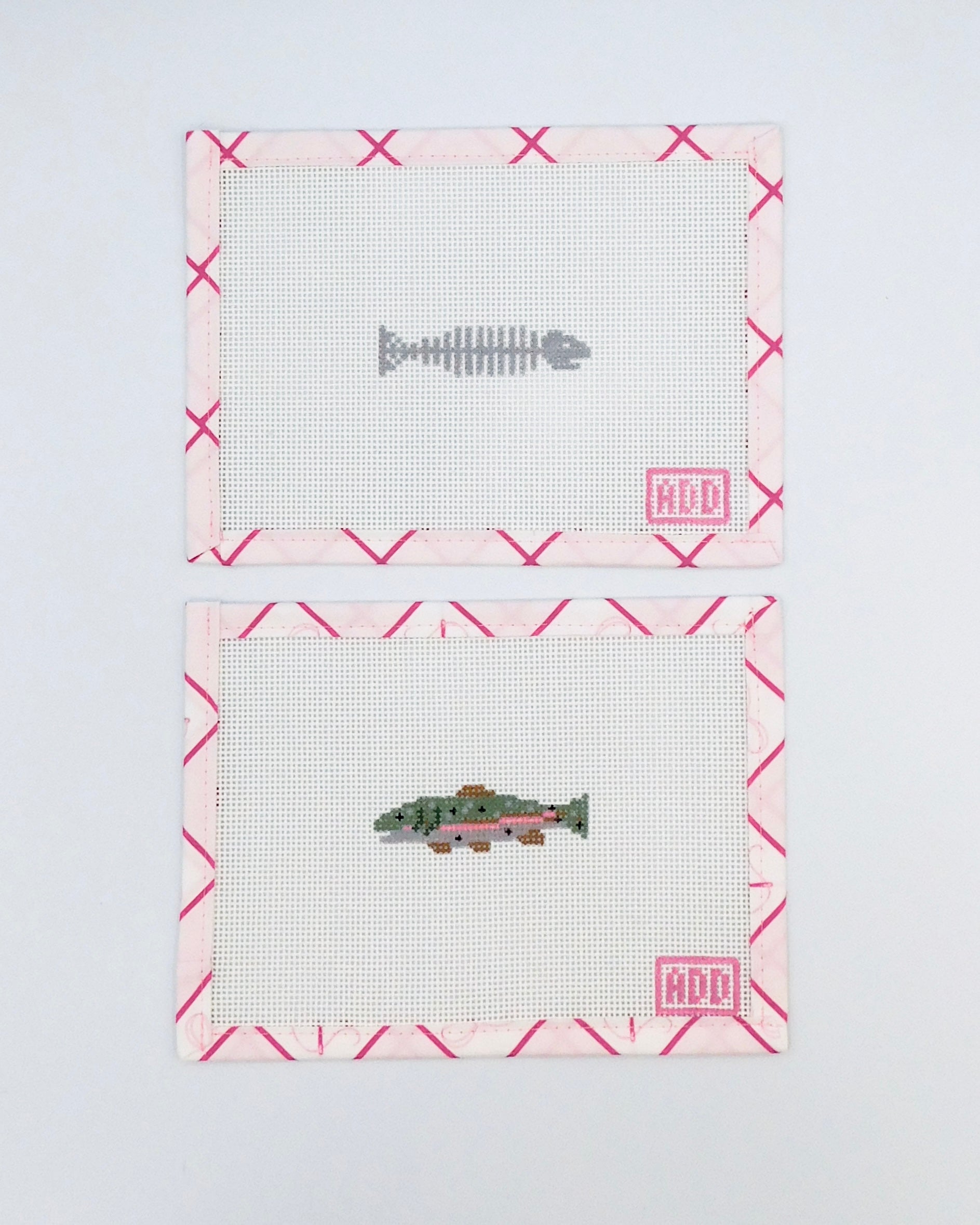 A fun beginner project, the Trout & Fish Bones canvases are designed to be mirror images of each other so they can be finished back-to-back as a two sided bag charm or ornament